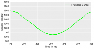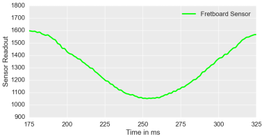 To measure this position we used a linear membrane potentiometer. The base layer consists of material with length dependent resistance. The middle layer is made of highly conductive material. The sensor therefore acts as a resistance linearly dependent on the point where the circuit is shorted. The benefits of this sensor type are described in. We chose sensors of length 100 mm; a trade-off between the sensors linearity and convenience to capture multiple notes from a single finger position. The membrane sensor is thin enough to be attached on the fingerboard of the cello. Additionally the motion of the finger on the fingerboard was recorded using a 3-axis accelerometers (Texas Instruments LM335), taped on the players fingers. All sensor data was sampled by an Arduino Due microcontroller at 12 bit resolution.